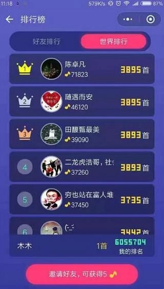 6、排行榜是刺激用户心理的好工具,这款小游戏也设置了排行榜功能。在首页下方就能找到它,通过排行榜,你既能查看自己在好友圈里的排名情况,也能了解世界范围内的排名。看完之后,是不是又有动力继续答题了呢?