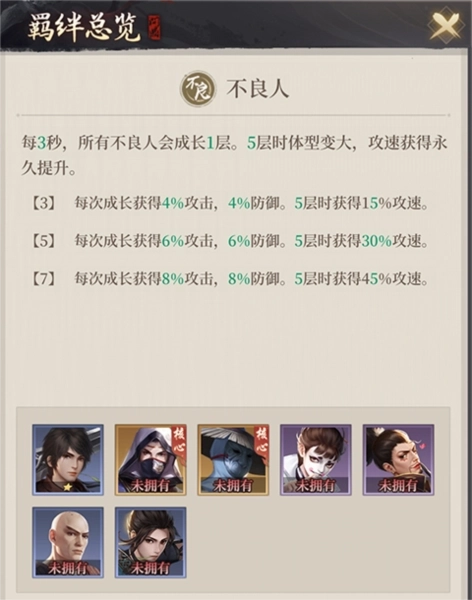 2、技能效果:战斗过程中,随着时间推移逐步叠加增益,持续强化全体不良人阵营角色的攻击力、防御力与攻击速度,同时角色体型会随之增大,这些属性加成在该场战斗内将永久保持效果。这使得不良人阵营的侠客具备了在战斗后期实现质变的潜力,部分原本并非以输出为主要定位的不良人角色,在阵营效果的层层叠加下,也能展现出超乎预期的强大输出能力。
