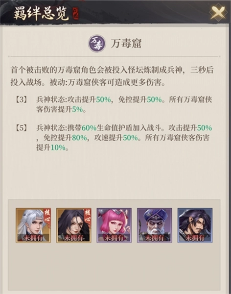 2、技能效果:该技能能够增强万毒盒侠客的伤害输出,并且队伍中首个被击败的万毒系侠客会被送入怪坛,经炼制转化为兵神后重返战场,相当于一次附带强化的复活机制。凭借这一效果,万毒侠客阵容缺乏前排坦度的短板得以弥补,使其可以更专注于提升伤害能力。特别是万毒侠客尤川,他作为神行职业的侠客,在复活返场后,切入敌方后排的操作会更加顺畅连贯。