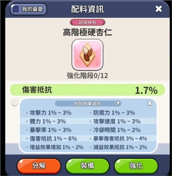 脆片巧克力:这类巧克力通常佩戴的主词条有三种选择,分别是伤抗、攻击和暴击。我个人因为另外两种配料实在太紧缺,所以默认选择带暴击,这样强化时的压力会小一些;一般来说,副词条堆到25点伤抗就够用了,但要是用来推图的话,还是建议优先考虑伤抗这个词条。