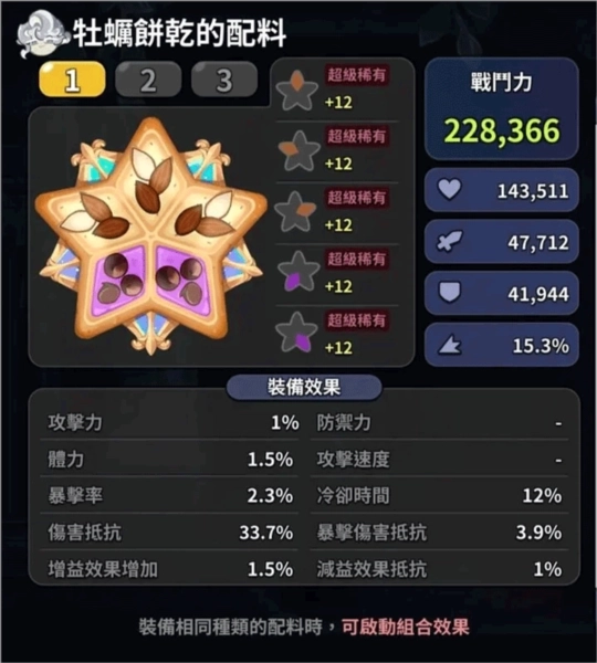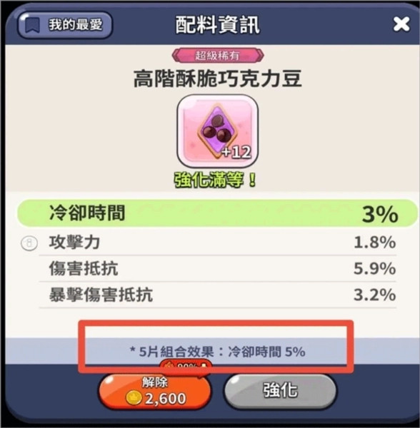 另外,把相同的配料组合在一起会触发套装效果,例如集齐5个巧克力豆就能额外获得5%的冷却增益。