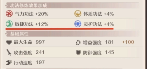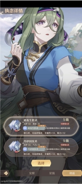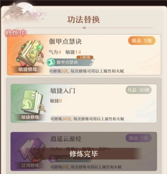点击下方相关属性旁,即可选择想要修炼的功法。这些功法正是我们从执念中获取的,每本功法都能提升整体的两类基础属性。