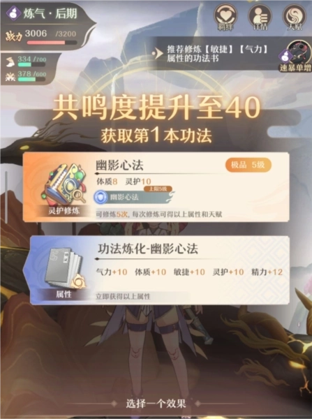 前期修炼时,当执念共鸣度达到40和80这两个节点,我们能获取相应的功法。各位小伙伴要留意啦,前期阶段务必优先选择功法,而非进行功法炼化;到了后期,大家就可以结合自身需求,灵活选择功法或是炼化处理了。