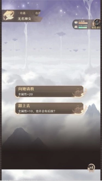 在游戏里,玩家的修炼进程分布在多个不同的小世界之中。游戏过程中,玩家会触发一些奇遇事件。当第三层小世界尚未解锁时,面对神女相关的选择,我们只需挑那些能让全属性获得较多提升的选项就行。等后期再次遇到神女,我们就能习得神女神功,修炼这套神功可以显著增强自身的整体属性。