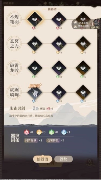 游戏里设有“器纹”系统,玩家在每次突破关键阶段时,都能获得一次选择器纹词条的机会。不同器纹词条的搭配组合,还能解锁各式各样的神器。玩家只需根据自身的发展方向进行选择就可以了。