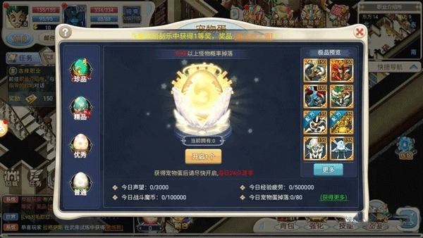 这款游戏名为合成版,并非指玩法上的合成,而是围绕宠物合成展开的。玩家通过打野怪、做任务能获得宠物蛋,需要注意的是,每天24:00前要开启这些宠物蛋,不然会被系统销毁。