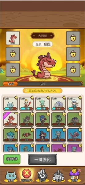 2、召唤并收集新伙伴,这里有丰富多样的小怪兽类型,而且它们还能不断进行强化呢