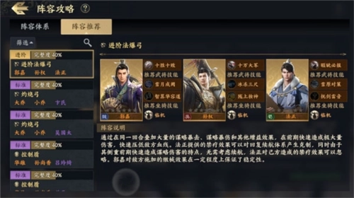 法爆体系专门针对连击队伍,核心思路是在战斗前期就打出最大化输出——通过同一回合内叠加各类状态效果、释放多段高额伤害技能来实现,比如郭嘉负责削减敌方的谋略防御,法正提升己方的谋略暴击率与暴击伤害,再搭配孙权或司马懿的谋略爆发伤害;还能携带像【冰冻三尺】【陇上妆神】这类前期收益突出的技能,进一步放大前期的输出能力,以此快速压低对手的血线。不过需要留意的是,要是遇上具备高减伤、高回复特性的敌军队伍,这套体系就很难占据优势了。