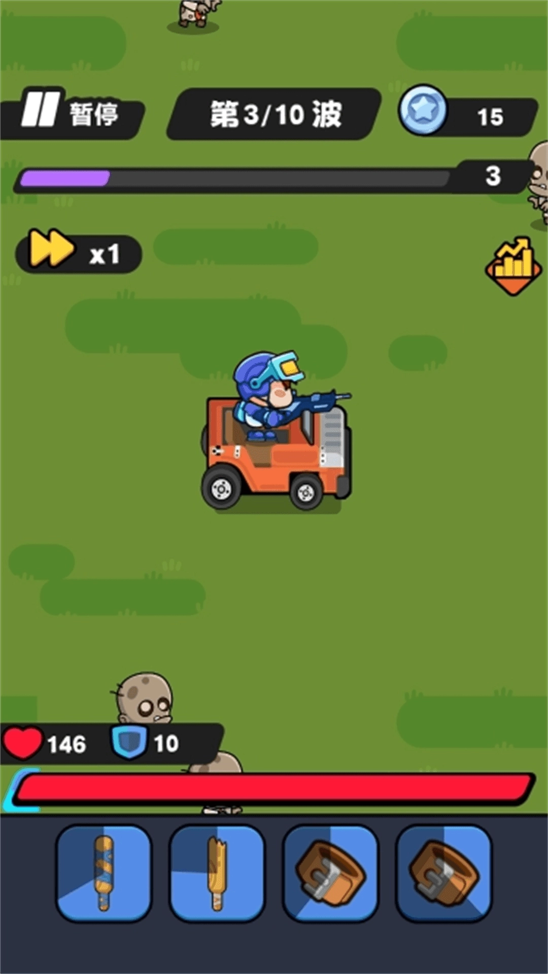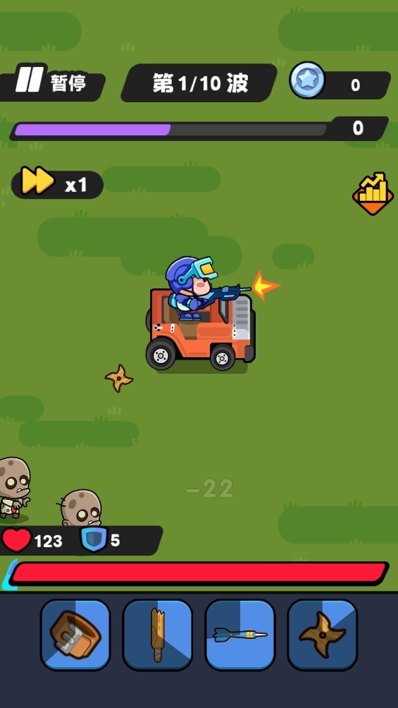 3.游戏上方可以看到,正中央显示的是还有多少波敌人,左下方爱心是你的生命值,右边的银币可以用来刷新商店购买武器装备。